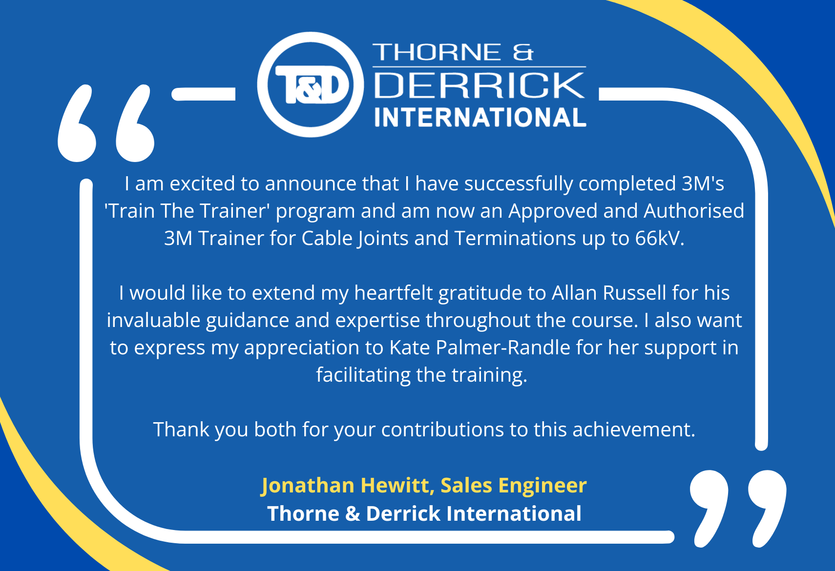 “The Train-the-Trainer concept enables Thorne & Derrick, as a Specialist Distributor for 3M Electrical since 1985, to bolster our customer service and field support to clients and is the perfect complement to our recent appointment as Approved 3M Electrical Kitting Partners – this is a further formidable personal achievement for Jonny Hewitt and another business accolade for Thorne & Derrick,” comments Chris Dodds (Sales & Marketing Manager – Thorne & Derrick).