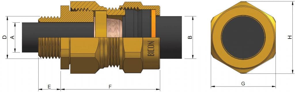 Prysmian Bicon KA414-64 (CX85) CX brass cable glands with 85mm entry thread enable cable termination of plastic or rubber sheathed wire braid armoured cables in indoor or outdoor applications – the CX85 cable glands are weatherproof and waterproof and suitable for 68-88mm cable diameters.