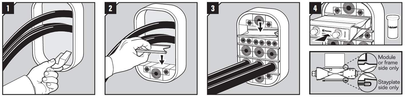 - 5. Lubricate all modules for the frame thoroughly, both the inside and the outside surfaces, using Roxtec Lubricant.